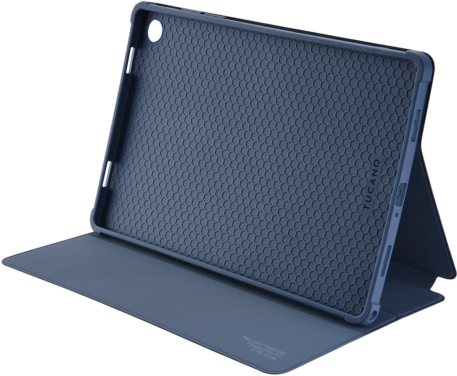 Samsung Galaxy Tab Hülle aus PU in Nylonoptik, hergestellt aus recyceltem Kunststoff. Die Innenseite besteht aus weichem, kratzfestem Material, und die Rückseite mit Kameraausschnitt ist aus weichem, schützendem TPU gefertigt. Die Vorderseite lässt sich in einen praktischen Ständer zum Schreiben und Lesen verwandeln. An der Außenseite befindet sich ein integrierter Ladeschlitz für den S Pen. Diese Hülle wurde aus drei 500-ml-Plastikflaschen hergestellt.